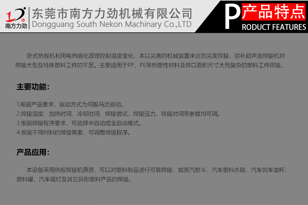 臥式熱板對(duì)接機(jī)是臥式熱板機(jī)的新型機(jī)。相對(duì)普通的立式而言,長(zhǎng)度不受限制。廣泛運(yùn)用于法蘭盤(pán)、汽車(chē)尾箱、油箱、尾氣凈器、空氣過(guò)濾器等大型塑料件、異性件。根據(jù)焊接面,臥式熱板機(jī)分為單面焊、雙面焊、對(duì)焊等不同規(guī)格,根據(jù)工件結(jié)構(gòu),選擇最佳的分模設(shè)計(jì)方案,增強(qiáng)焊接面的牢固性。降低熔接深度。提高生產(chǎn)效率和產(chǎn)品合格率。